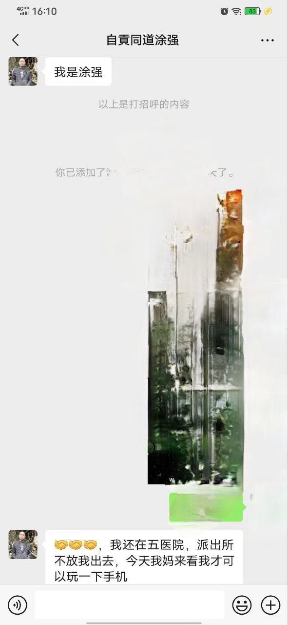 此外涂强给网友发私信表示自己还在“五医院”,派出所不给他出去,因为他母亲去看他才得以用手机发信息。