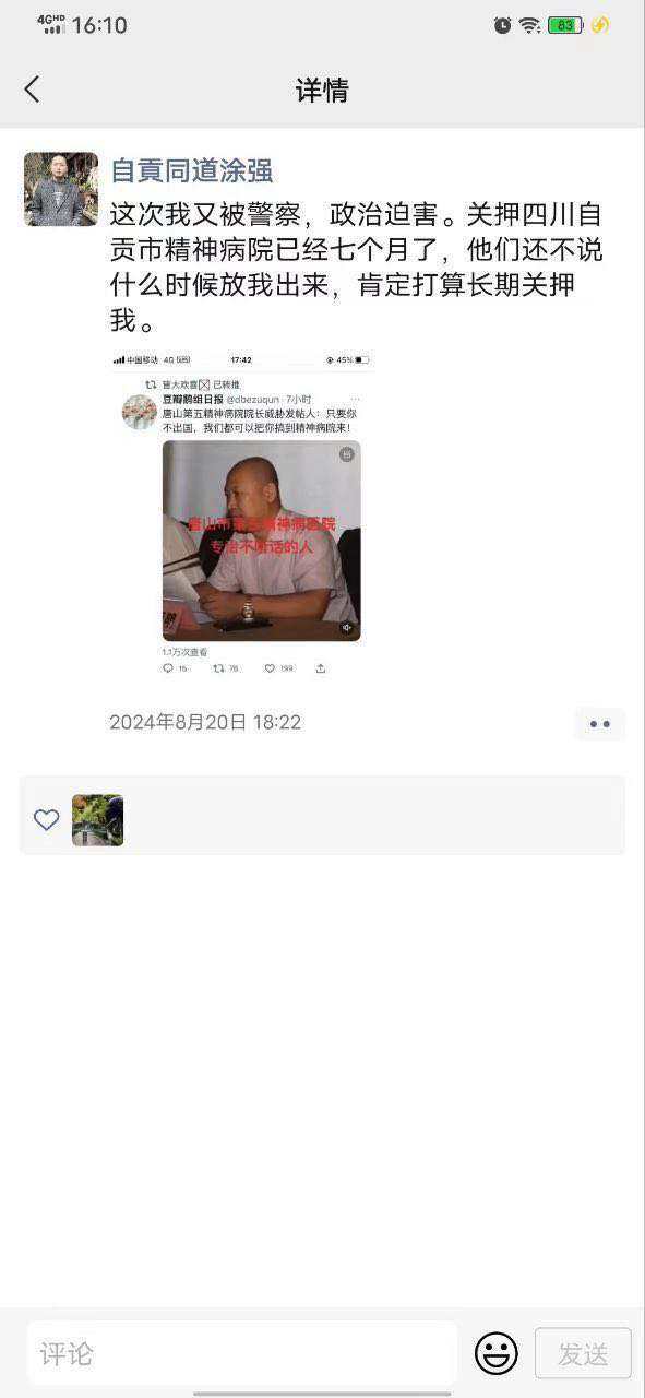 (维权网信息中心报道)2024年10月1日,本网获悉:四川自贡异议人士涂强2024年8月20日在微朋友圈发信息说:“这次我又被警察政治迫害。关押四川自贡市精神病医院已经七个月了,他们还不说什么时候放我出来,肯定定打算长期关押我。”