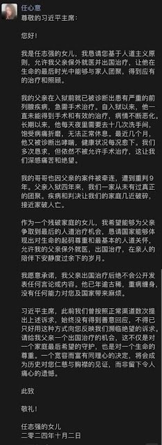 (维权网信息中心报道)2024104日,本网获悉:任志强女儿公开致信习近平,请求允许病重父亲出国治疗。全文如下: