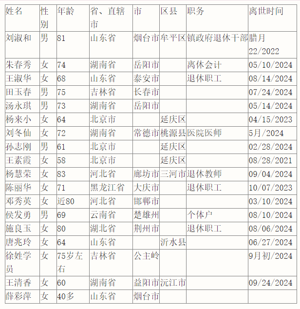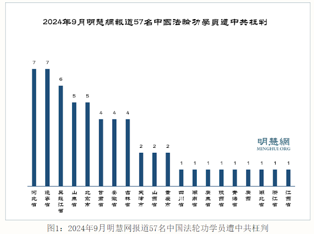 (维权网信息中心报道)2024107日,本网获悉:据明慧网报道统计,二零二四年九月份又获知18名中国大陆法轮功学员遭迫害离世或含冤离世;至少有57名中国大陆法轮功学员遭中共非法判刑,平均年龄63岁(不包括年龄未知者),非法判刑最严重地区依次为:河北省、辽宁省均7人,黑龙江省6人、山东省、北京市均5人。非法刑期最高达十三年。
