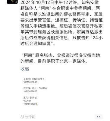 2024年10月12日中午12时许,知名安徽籍媒体人“柯南”在合肥家中养病期间,两名自称是长淮派出所的便衣警察带走,家属要求出示警官证、逮捕证、传唤证、拘留证等相关手续遭拒绝。随后被便衣警察开私家车其带到瑶海区长淮派出所,家属抵达派出所后依然未获得相关信息,只被告知“24小时后会通知家属”。