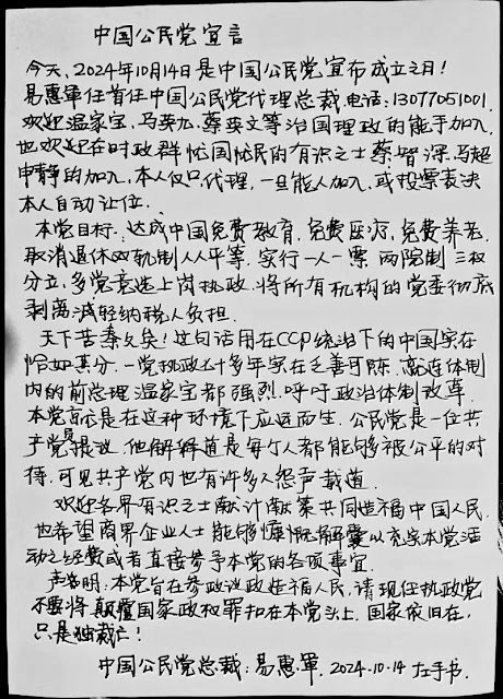 该宣言最后写道:“天下苦秦久矣!这句活用在CCP(中共)统治下的中国实在恰如其分。一党执政七十多年实在乏善可陈,就连体制内的前总理温家宝都强烈呼吁政治体制改革。 本党就是在这种环境下应运而生。公民党是一位共产党员提议,他解释道是每个人都能够被公平的对待。可见共产党内也有许多人怨声载道。 宣言还强调说:本党旨在参政论政造福人民,请现任执政党不要将颠覆国家政权罪扣在本党头上。国家依旧在,只是独裁亡!  中国公民党总裁:易惠军 2024.10.14 左手书。”