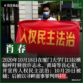 因2020年10月18日在厦门大学门口拉横幅呼吁释放许志永、黄琦、李怀庆、王臧、余文生、程渊、丁家喜、张展等良心犯。并宣传人权、民主、法治等理念,于2020年10月20日被福建省南安是警方抓捕。在没有通知家属的情况,被当局以“寻衅滋事”的名义秘密判刑4年,截止目前家属都未曾收到判决书。肖春已于2021年5月20日移送至福建省漳州监狱服刑。