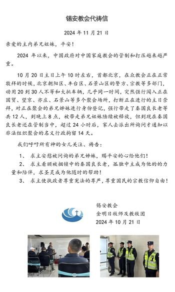 (维权网信息中心报道)20241023日,本网获悉:20241020日星期日上午10时左右,北京锡安教会多个堂点同时受冲击。北京朝阳区、丰台区、石景山区的警方、宗教等多部门,动用2030人不等和大批车辆,几乎同一时间,突然强行闯入正在国贸、望京、亦庄、石景山等多个聚会场所,打断正在进行的主日崇拜,对正在聚会的基督徒进行身份登记,强行带走了秦国良长老等共12人。