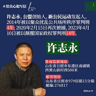 目前,许志永在狱中的状况十分非常危急,因为这些作恶者无所顾忌、恣意违法。为了许志永能平安、健康的走出监狱,希望大家能给予许志永以持续的关注,尤其是海外的朋友们,有广泛的发声和有效行动的自由,希望大家给予有力的呼吁。