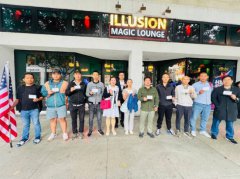 2025年10月25日,中国民主党国际联盟主席界立建(右二)、六四诗人蒋品超(右三)、前中国大学教师刘安琪(左五)、中国民主党党员刘敏(左四)等华人来到圣莫妮卡Illusion Magic L...