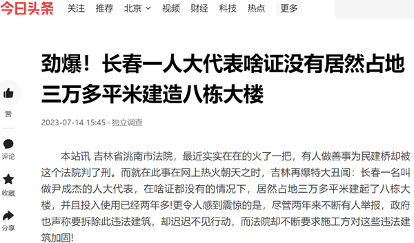 本站讯 吉林省洮南市法院,最近实实在在的火了一把,有人做善事为民建桥却被这个法院判了刑。而就在此事在网上热火朝天之时,吉林再爆特大丑闻:长春一名叫做尹成杰的人大代表,在啥证都没有的情况下,居然占地三万多平米建起了八栋大楼,并且投入使用已经两年多!更令人感到震惊的是,尽管两年来不断有人举报,政府也声称要拆除此违法建筑,却迟迟不见行动,而法院却不断要求施工方对这些违法建筑加固!