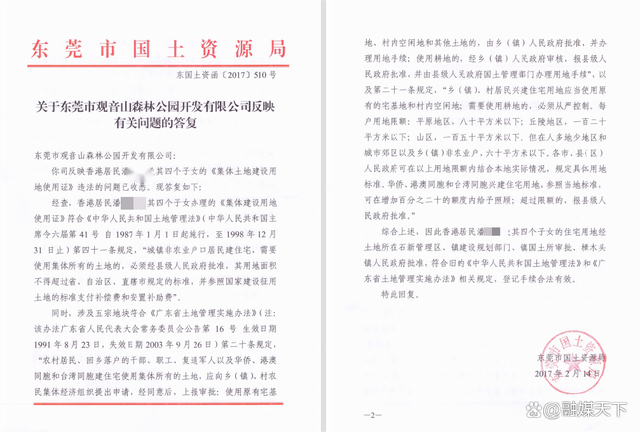 面对举报,2017年2月14日,当时的东莞市国土自然资源局答复称,香港居民潘某某及其四个子女的住宅用地符合旧的《土地管理法》和《广东省土地管理实施办法》的相关规定,登记手续合法有效;余某某的土地使用权依法登记,权属清晰,程序合法,受法律保护。而对这处别墅用地之前是否属于林地,是否经过了林业部门的同意,几个香港人是否属于回乡定居,只字不提。