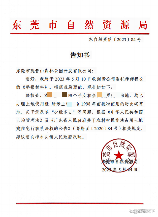 东莞市自然资源局2023年5月的告知书