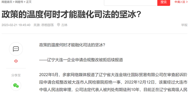 2022年5月,多家网络媒体报道了辽宁省大连金瑞仕国际贸易有限公司在审查起诉阶段申请合规整改被大连市人民检察院拒绝一事,2022年12月12日,该案经过大连市中级人民法院审理,公司法定代表人被判处有期徒刑10年,目前正在辽宁省高级人民法院二审审理过程中。