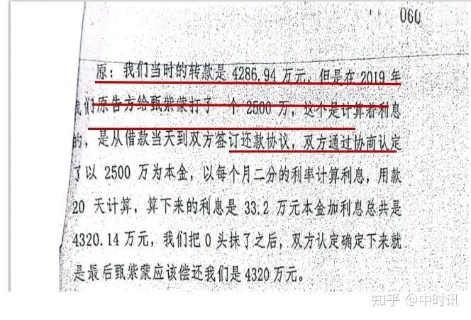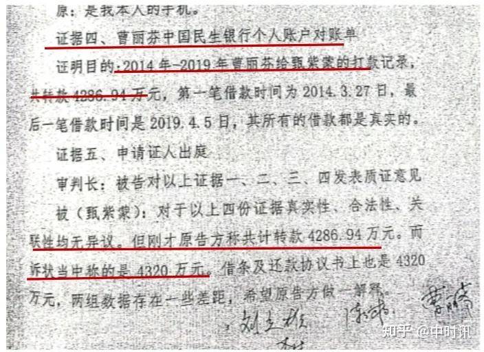 在两次一审庭审中,曹丽芬就起诉甄紫蒙向其借款4320万元前后出示两套不同的证据、两种不同的说法。