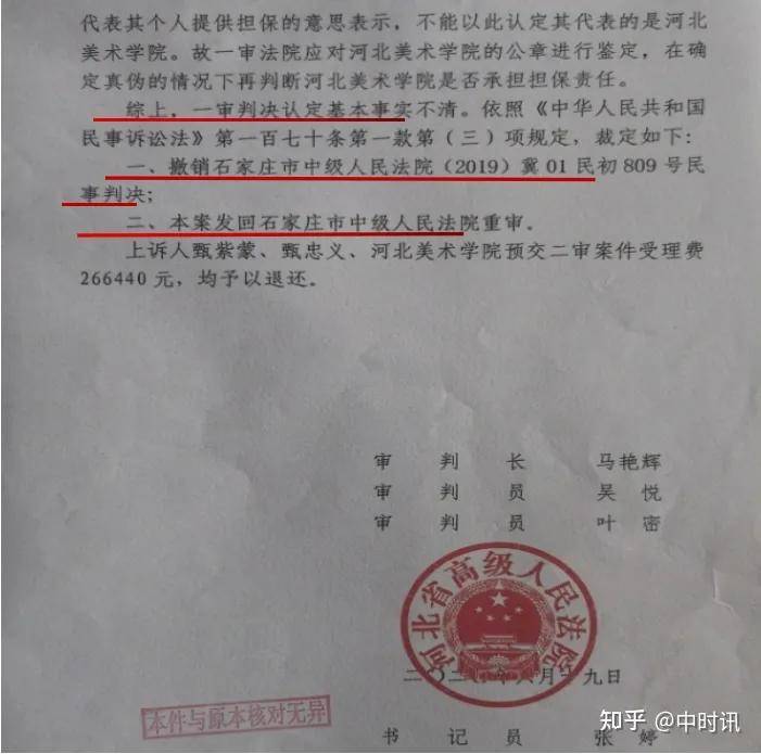 石家庄中级法院判令河北美院对甄紫蒙借款4320万元承担连带赔偿责任;河北省高级法院撤销该判决书,发还石家庄中级法院重审。(见上图)