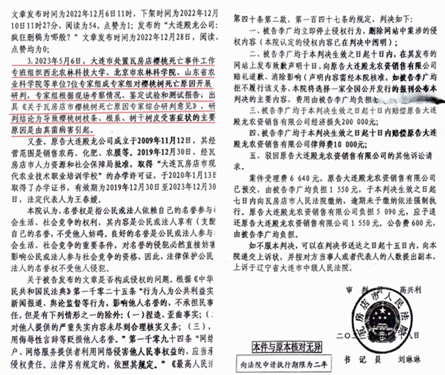 李广军向媒体介绍:2022年12月6日前后,因一位辽宁一家官方媒体老记者所求,他在自己管理的网站上转发了今日头条、腾讯等媒体刊发的关于瓦房店樱桃树大面积死亡事件的报道。第三天,即12月8日,大连殿龙农资销售有限公司(简称:大连殿龙)即与他联系删贴,因稿件所涉证据确凿,而大连殿龙并没有提供有力证据而未能删除,他万万没有想到大连殿龙竟然暗中起诉他名誉侵权!