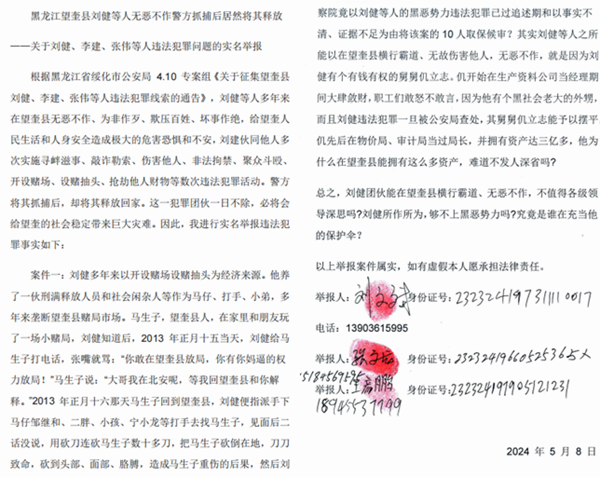 根据黑龙江省绥化市公安局 4.10 专案组《关于征集望奎县刘健、李建、张伟等人违法犯罪线索的通告》,刘健等人多年来在望奎县无恶不作、为非作歹、欺压百姓、坏事做绝,给望奎人民生活和人身安全造成极大的危害恐惧和不安,刘建伙同他人多次实施寻衅滋事、敲诈勒索、伤害他人、非法拘禁、聚众斗殴、开设赌场、设赌抽头、抢劫他人财物等数次违法犯罪活动。警方将其抓捕后,却将其释放回家。这一犯罪团伙一日不除,必将会给望奎的社会稳定带来巨大灾难。因此,我进行实名举报违法犯罪事实如下: