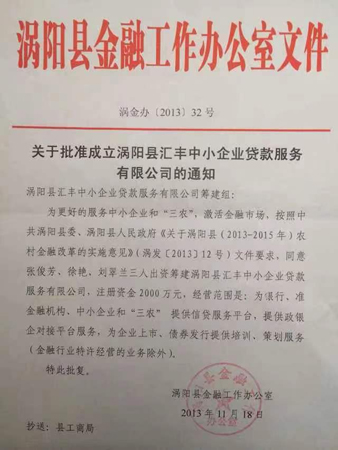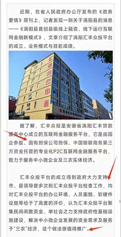涡阳汇丰、四联公司是经政府批准成立、以政府为主导的合法服务平台,是为银行、准金融机构、中小企业和“三农”提供信贷服务平台,提供政银企对接平台服务,并且是“涡阳人民法院诉讼保全担保业务合作”单位、工商局授予“守合同重信用”单位。两家公司已经营十多年,多次被安徽省评定“全省金融改革试点的P2P管理服务平台,并且是全国县级首创”。省发展研究中心张某明处长、市人行征信科科长王某亚及县金融办主任程某,也曾到涡阳县汇丰贷款服务中心检查指导工作。省、市相关金融管理部门也多次对两家公司誉为楷模,称为“利用民间闲散资金支持三农”。出借形式:以担保和不动产抵押开展个人与企业之间的融资借贷模式业务,汇丰公司承担对借款企业资质、抵押资产的审核,不直接与贷款企业产生信贷关系。