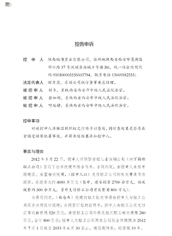 我们公司认为,程冬、张如领、呼延静三个人已涉嫌滥用职权,于是依据《人民法院审判人员违法审判责任追究办法(试行)》第十四条第一款规定,于2023年年末,向西安市中级人民法院的法官违法违纪举报中心提交了控告申诉,要求对“故意违背事实和法律,作出错误裁判的”程冬、张如领、呼延静这三个人追究违法审判责任。