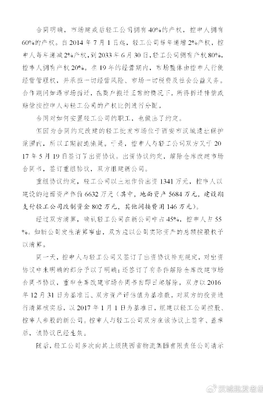 合同明确,市场建成后轻工公司拥有40%的产权,我们公司拥有60%的产权。自2014年7月1日起,轻工公司每年递增2%产权,我们公司每年递减2%产权,到2033年6月30日,轻工公司拥有产权80%,我们公司拥有产权20%。在19年的经营期内,市场整体由我们公司行使经营管理权,并承担一切经营风险、市场一切税费及社会公益义务。合作期间如遇市场拆迁,在商户搬迁正常的情况下,所得拆迁补偿或赔偿按我们公司与轻工公司的产权比例进行分配。