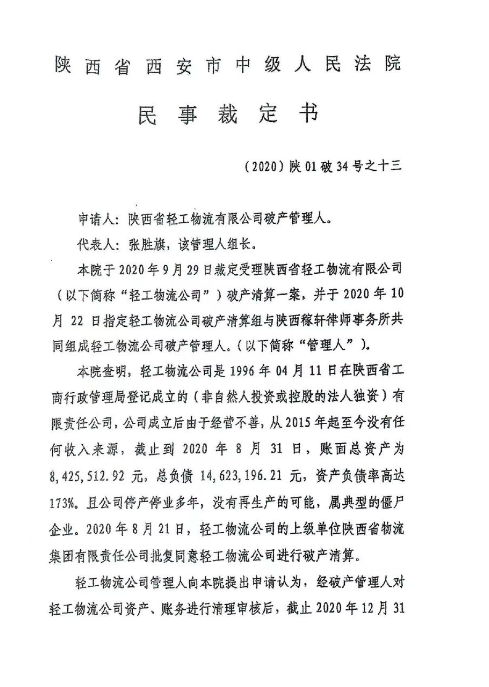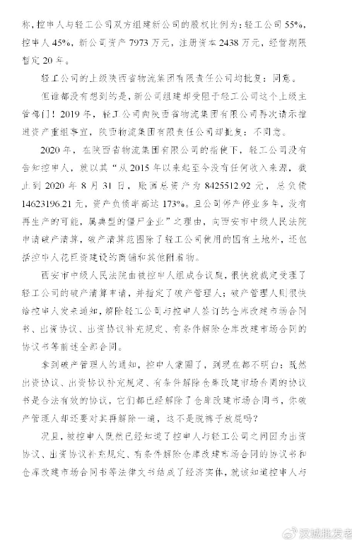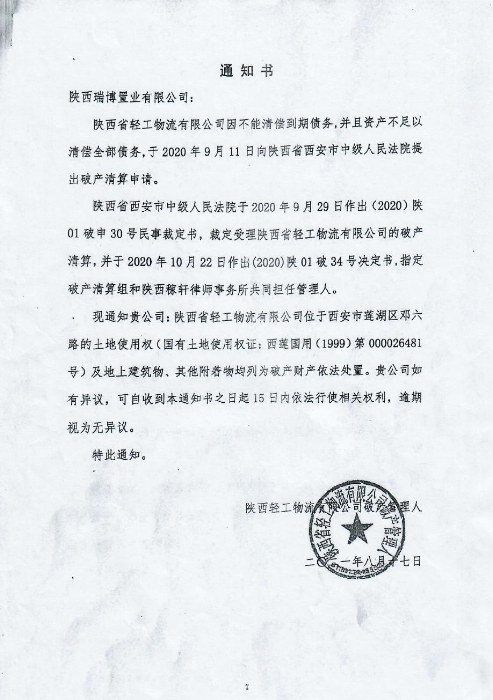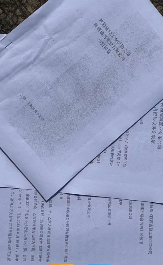 2020年,在陕西省物流集团有限公司的指使下,轻工公司没有告知我们公司,就以其“从2015年以来起至今没有任何收入来源,截止到2020年8月31日,账面总资产为8425512.92元,总负债14623196.21元,资产负债率高达173%。且公司停产停业多年,没有再生产的可能,属典型的僵尸企业”之理由,向西安市中级人民法院申请破产清算,破产清算范围除了轻工公司使用的国有土地外,还包括我们公司花巨资建设的商铺和其他附着物。