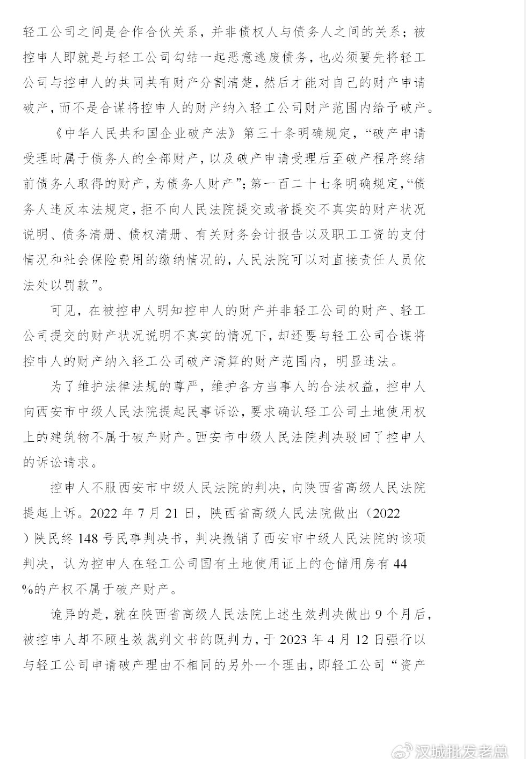 诡异的是,就在陕西省高级人民法院上述生效判决做出9个月后,程冬、张如领、呼延静三个人却不顾生效裁判文书的既判力,于2023年4月12日强行以与轻工公司申请破产理由不相同的另外一个理由,即轻工公司“资产总额48638344.16元,负债总额58205972.87元,资产负债率119.67%。已经资不抵债、不能清偿到期债务、符合法定破产清算条件”,公然将我们公司的财产纳入轻工公司破产清算范围之内,宣告轻工公司破产。