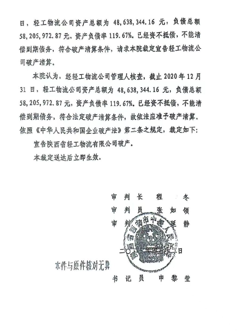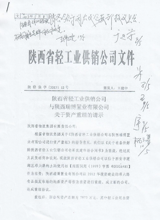 但谁都没有想到的是,新公司组建却受阻于轻工公司这个上级主管部门!2019年,轻工公司向陕西省物流集团有限公司再次请示推进资产重组事宜,陕西物流集团有限责任公司却批复:不同意。