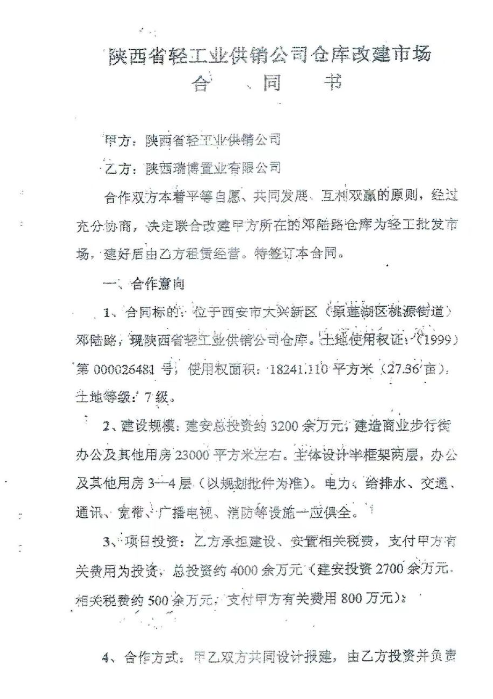 2012年5月22日,我们公司与陕西省轻工业供销公司(以下简称轻工公司)签订了仓库改建市场合同书。合同约定,由我们公司承担市场建设、安置相关税费,(我们公司以)支付轻工公司的有关费用作为投资,总投资大约4000多万元(其中,建安投资2700余万元,相关税费约500余万元,另外支付轻工公司有关费用800万元)。