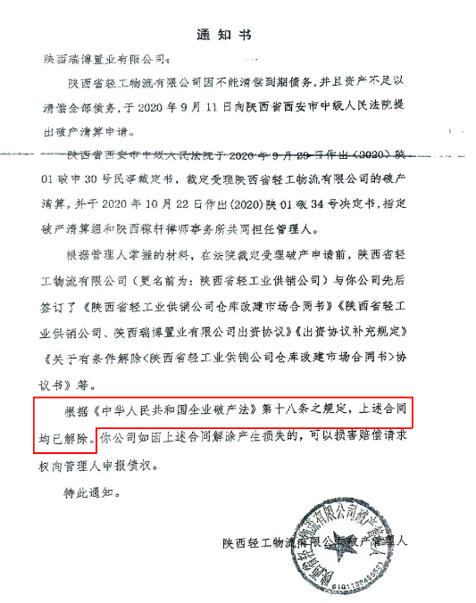 西安市中级人民法院由程冬、张如领、呼延静三个人组成的合议庭,很快就裁定受理了轻工公司的破产清算申请,并指定了破产管理人;破产管理人则很快给我们公司发来通知,解除轻工公司与我们公司签订的仓库改建市场合同书、出资协议、出资协议补充规定、有条件解除仓库改建市场合同的协议书等前述全部合同。