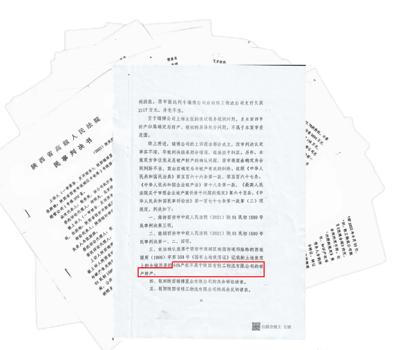 陕西省高级人民法院判决,我们公司在轻工公司国有土地使用证上的仓储用房有44%的产权不应纳入破产范围