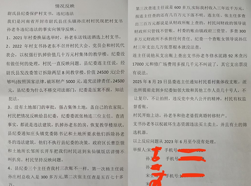 另据村民反映,孙东东当支书期间,该村的账务混乱不清,质疑支书有贪污行贿行为,村民实名举报到县纪委。该县纪委第一次杨某主任向村民说总收入300多万,第二次张某主任说总收入570多万,第三次连某主任说600多万,村民认为实际收入是近千万。连主任说还有几百万下落不明,多查出的300多万都是从财政所账上查到的,财政所领导说他们只管钱不管帐,他们不承担任何责任。该县纪委一位女领导说孙庄三年支出几万帐票根本就没法查。连主任对村民说从支出账上查出支书孙东东修水泥路92米涉嫌贪污17000元,修广场费用多报几千块不叫说了,其他只出票就没有说法了。25年8月23日,连主任通知村民看村集体收支帐,当地政府、派出所提前安排工作人员几十人,如临大敌,现场不让复印,不让拍照,现场群众很不理解,这是村民合法正当的权力为啥被剥夺了?