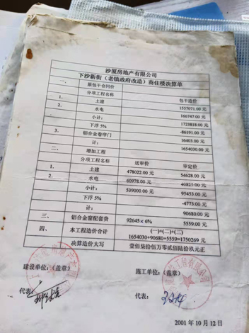 在施工期间,沙厦房地产公司内部结构调整,老政府改造项目,原签订合同是与沙厦房地产公司法人樊某祥签订,在没有任何交接的情况下,后沙厦房地产公司法人变更为钟某元,在施工过程中,钟某元以各种理由刁难,在2001年5月11日签订苛刻不平等条例补充协议。在工程符合验收条件后,迟迟不肯验收,一直拖到8月份才验收,还不肯结算,在多方努力下于2001年10月12日才结算,他的目的是要不付工程款,后来根据双方商定,工程为合格工程,不报优良工程,以前的协议合同全部作废,以最终的结算单金额1750269元为准与我结算工程款,并由他本人签字日期为证。