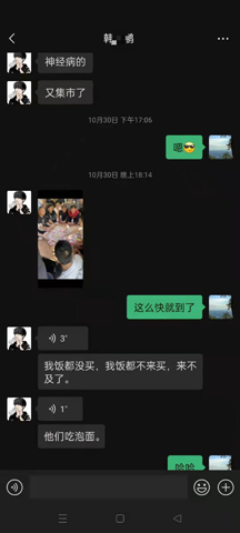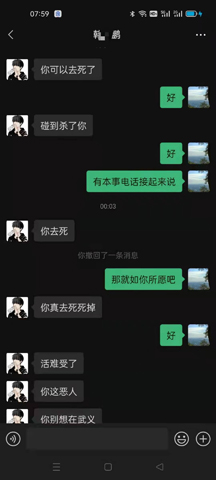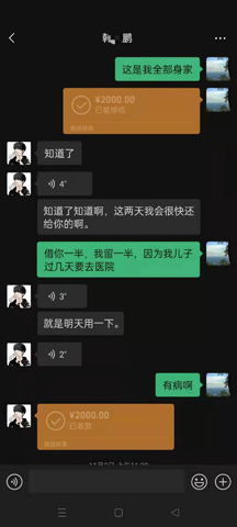 后来朋友催我还钱。我试图向韩某鹏催债,被他一次次恶语相向,一次次欺骗,就是一直往后推。直到前天同城刷到他妻子抖音,才知道他儿女双全,从一开始他就精心编织很多谎言骗我。在我和他妻子拆穿他的谎言后就威胁、恐吓我,让我在武义呆不下去,让我不得好死。