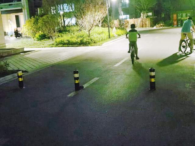 在小区内一条南北道路上,为了不让车辆进入,物业在道路上安上了三根只有三、四十公分高的金属桩,并且安在灯光的阴影下,晚上院里的孩子们骑车玩耍一旦撞上,后果不堪设想。