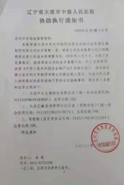 2021年2月3日,大连市中级法院做出《协助执行通知书》,将百利公司实际出资股东权益调整为零,百利公司被违法破产。